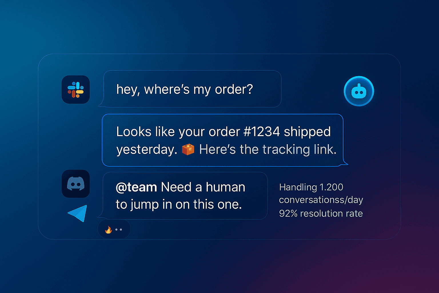 This AI agent can actually send responses on your behalf. Answers routine questions automatically, resolves common issues, and notifies your team when a human touch is needed. Every conversation is covered, no message goes ignored, and users get timely, accurate replies.